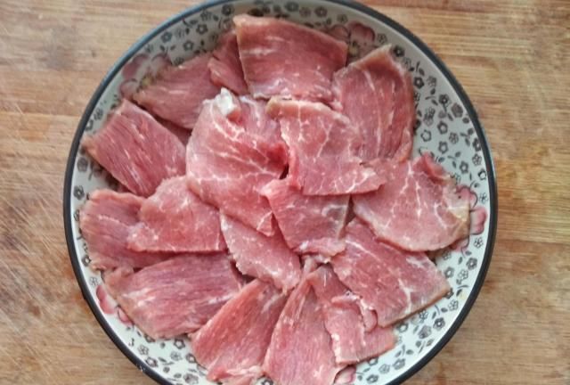 1、猪里脊肉用清水冲洗干净,放在菜板上,以“横切牛羊竖切猪”的原理把猪肉切成3mm左右的薄片,装盘备用,把大蒜拍碎切成蒜末备用。