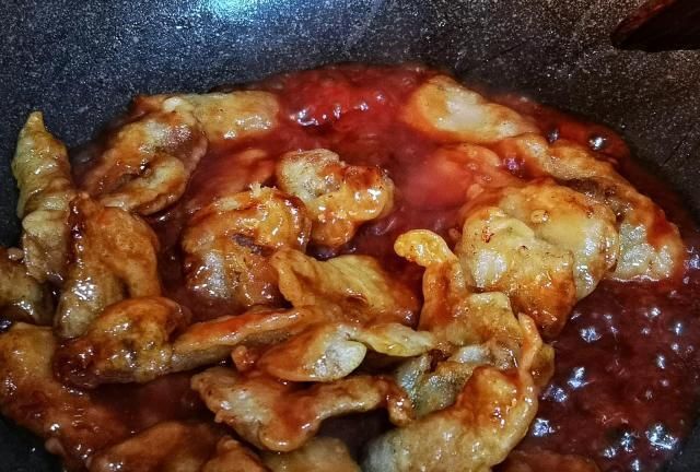 2、肉片裹了面糊之后一定要炸两次,而且第二次的油温要高,时间要短,这样做出的锅包肉才能外皮香酥,内里鲜嫩。