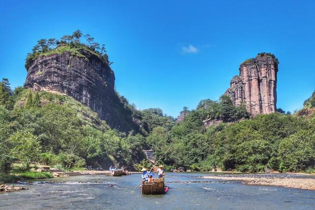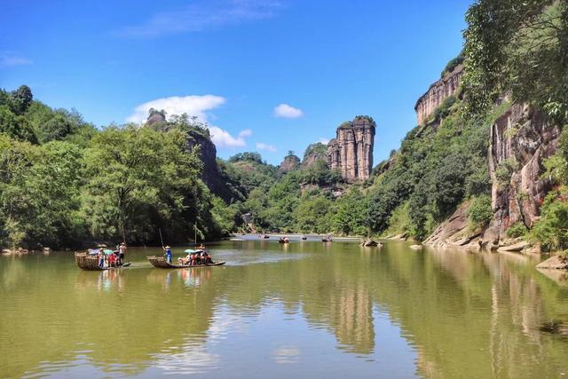 在武夷山这里游山玩水。攀登天游峰,再到桃源洞,然后花半天时间,乘坐竹筏游览两岸青山、碧水中流。武夷山的山体因为火山喷发,逐渐形成独特的丹霞地貌,历史上又是三教合一圣地,所以被评为了世界自然和文化的双遗产。大王峰、仙女峰,无论从哪个角度来看,景色都是异常壮美。乘坐竹筏经过时,不由得感慨这个天然奇观,好像深入盗墓笔记中的景致老外看到这个景色,绝对就疯了。在山体中间,还散落着许多石洞,里面放着石棺,到目前这也是未解之谜,没人说得清楚是怎么来的,是怎么运上去的,或者为什么要放上去。