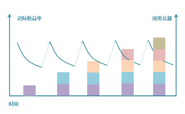 时间往下推移,比如考上重点高中、越来越帅,边际递减曲线再次右移,如此边际收益率会保持相对高水平,边际总额会一直增加。
