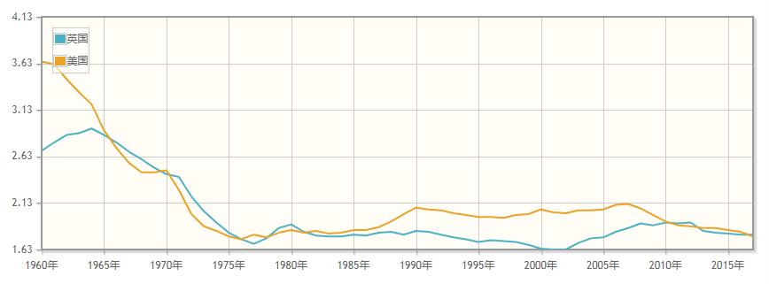 1960年,美国出生率高达3.65%,这一年FDA正式批准Enovid作为避孕药出售。次年开始,生育率开始遭遇滑铁卢,一直下跌到1976年1.74%;英国则从1964年2.93%迅速下降到1977年1.69%。