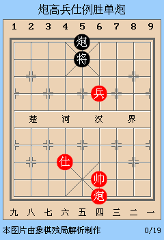 炮高兵仕例胜单炮取胜方法:帅兵分控两助,以仕为炮作架攻其中路,或以兑炮的手段取胜。