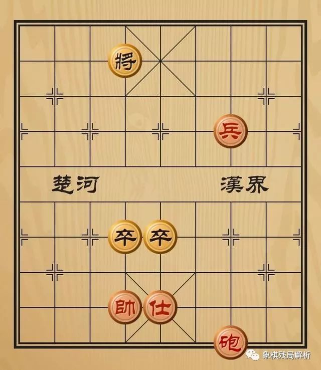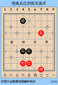 炮高兵仕例胜双高卒,本例红方只要用炮牵住黑方双卒,不给黑卒有换仕的机会,然后用兵逼禁黑将,使其只能动卒而失去联手护将的作用即可取胜。