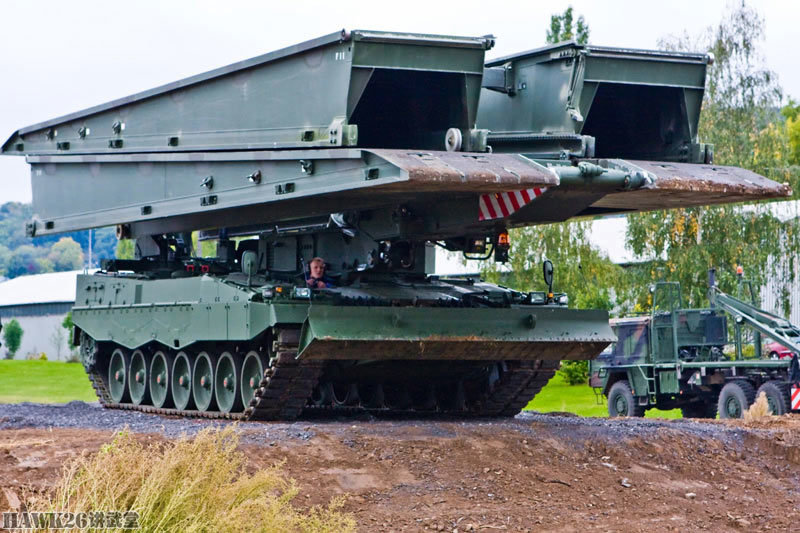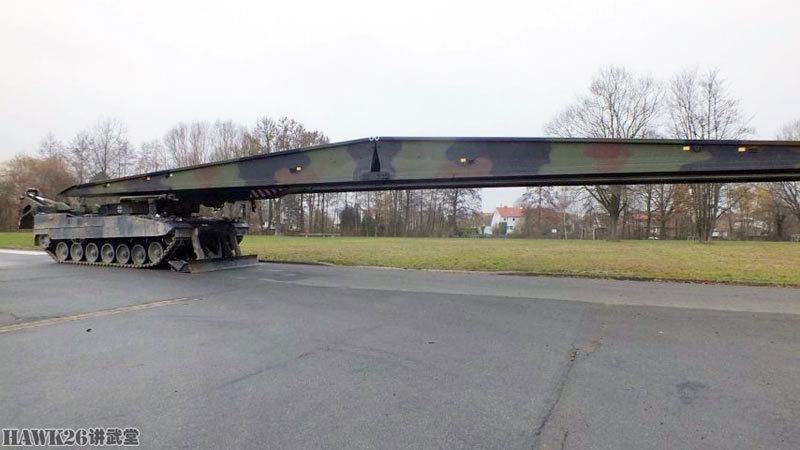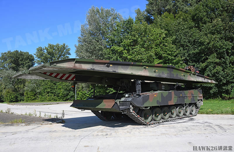 “鬣蜥”坦克架桥车可以配备一个26米长的机械化平推桥,或两个14米长的车辙桥,跨越障碍的宽度分别达到24或12米。而且,车辙桥可以重叠架设,两个26米长的平推桥可以跨越最大宽度为40米的障碍;一个26米和一个14米的车辙桥,可以跨越32米宽的障碍;两个14米的车辙桥,可以跨越最大宽度20米的障碍。