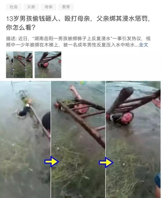 湖南岳阳一男孩做坏事不悔改,其父一怒之下把他绑在木梯上,反复压入水中呛水。