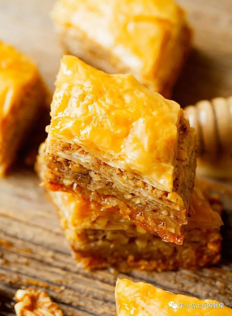 还有土耳其风格的甜点baklava巴克拉瓦,由很薄的刷过黄油的酥皮一层又一层裹起,中间夹着几层碎果仁(基本上是核桃、杏仁、开心果之类的坚果),烤好之后在面上浇一层糖浆或蜂蜜。烤好的baklava浸在蜜糖中,散发着金黄的色泽,闻着芳香甜蜜,咬一口,酥松香脆......