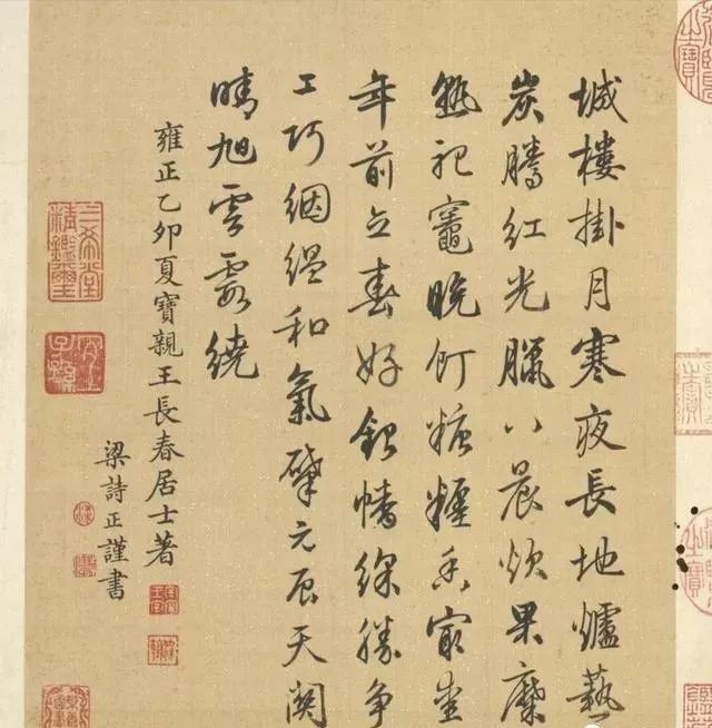 梁诗正(1697-1763),字养仲,钱塘(今浙江杭州)人。雍正八年探花,官至东阁大学士,卒谥文庄。书法初学柳公权,继参赵孟頫、文徵明,晚师颜真卿、李邕。著有《矢音集》。