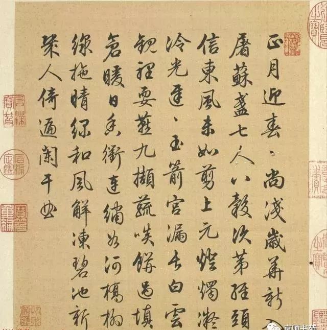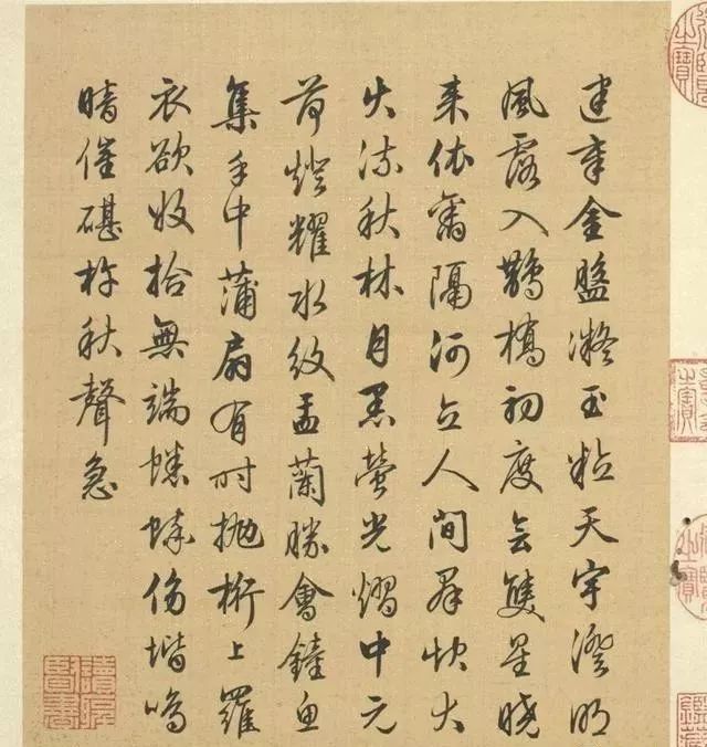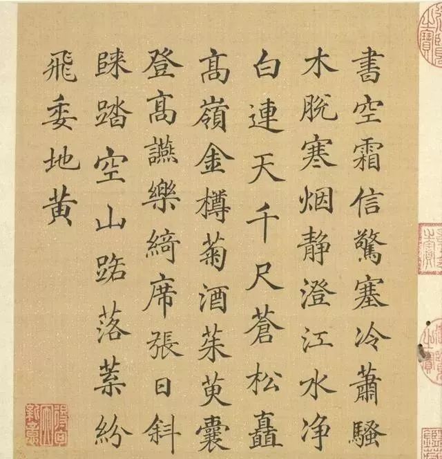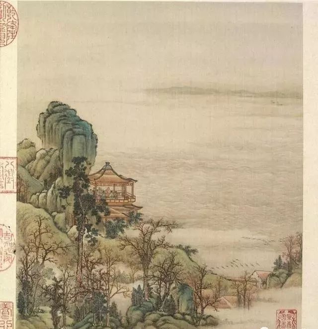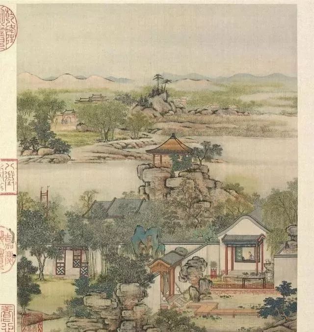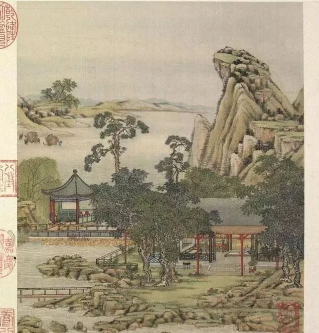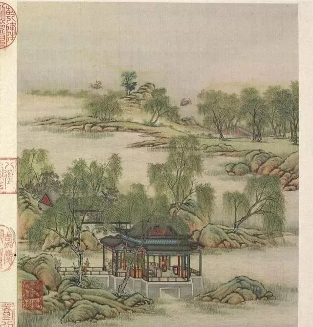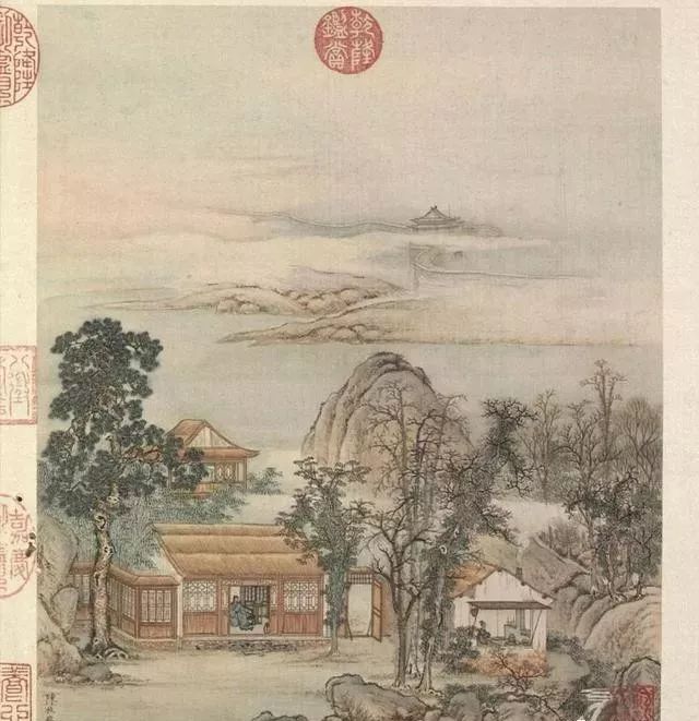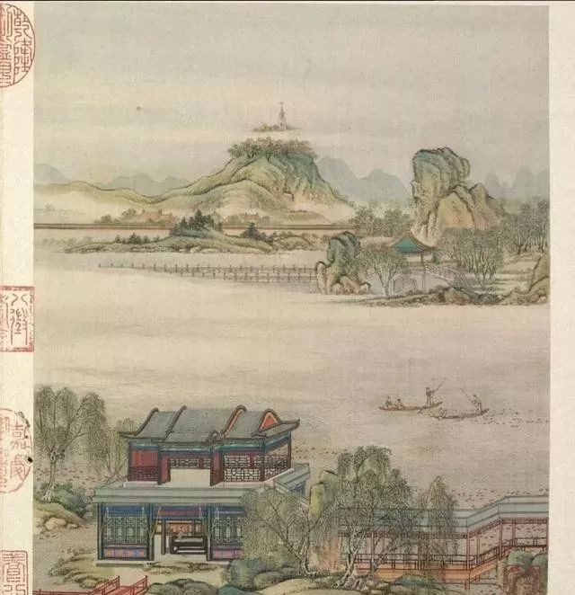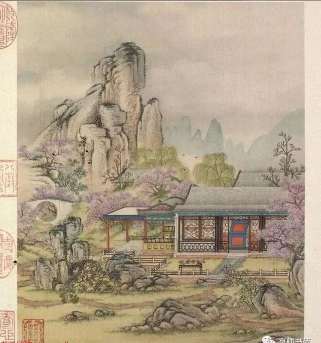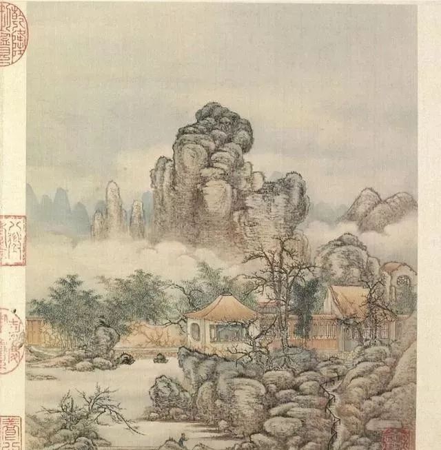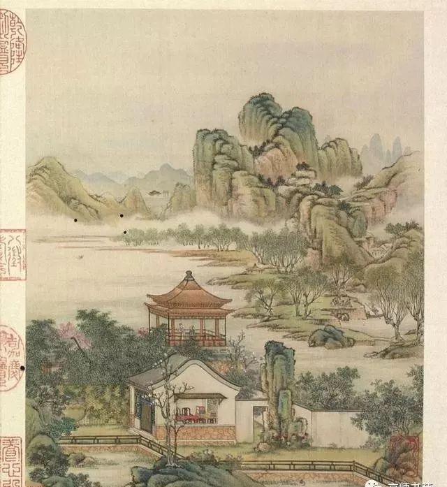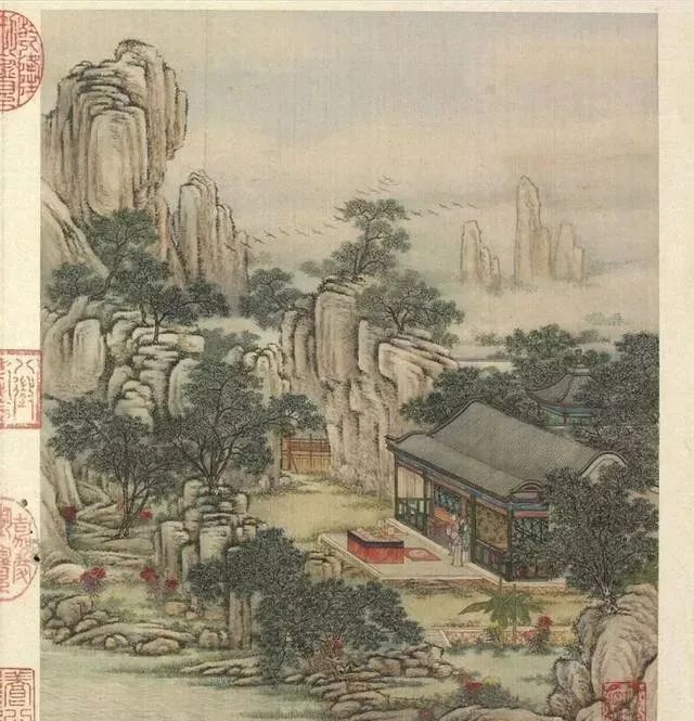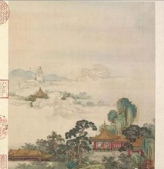 清代梁诗正书法《陈枚绘山水楼阁图》,绢本设色,12页,每页纵31厘米,横25.3厘米。故宫博物院藏。