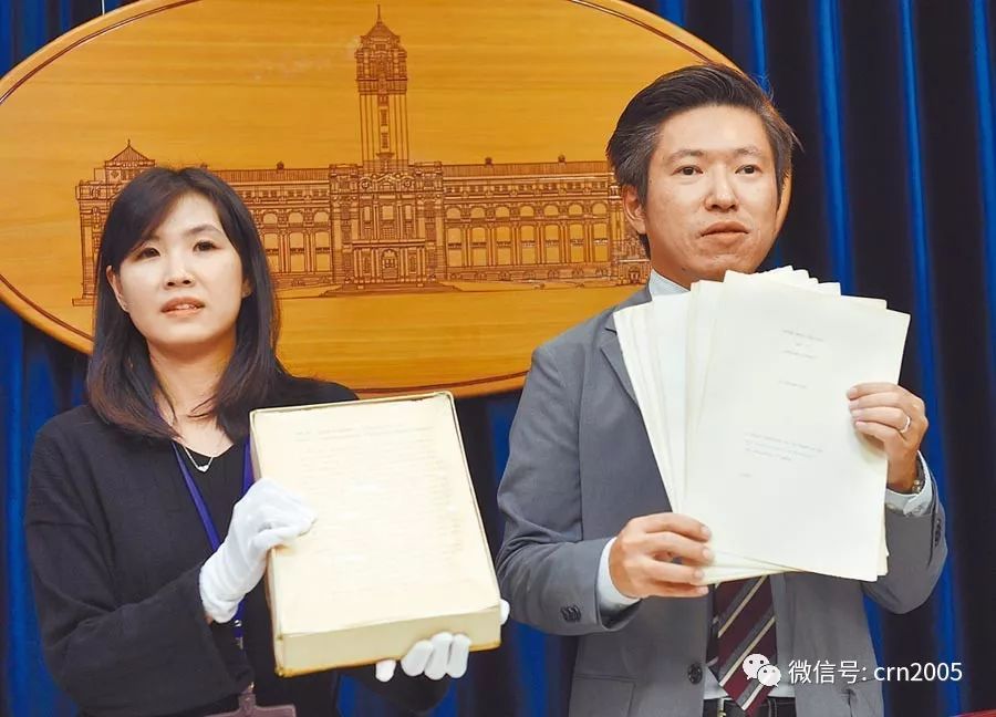“总统府”23日公布蔡英文博士论文原始文件,发言人张惇涵(右)强调蔡总统博士学位绝无问题。(中央社)