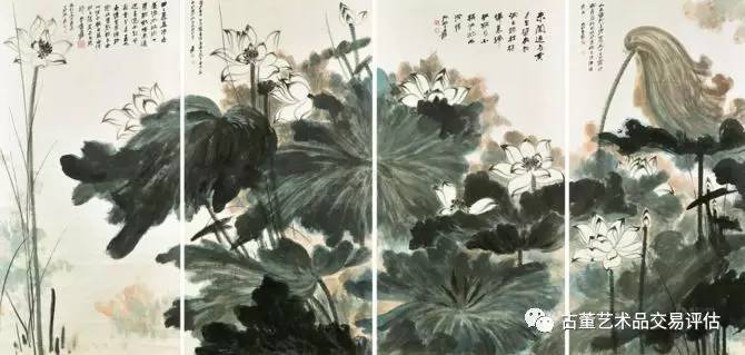 纵观大千先生的荷花,早年多水墨写意,初期从八大山人、石涛到青藤、白阳,亦兼用浅绦法。中年受敦煌壁画之影响,兼作工笔重彩荷花,并作巨幅的墨荷和用没 骨法画荷。到了晚年将山水画的泼墨技法运用到画荷上。开创出他自己的独特风格。因此在中国画荷史上,张大千先生可堪称是自八大山人、石涛以来中国百年第一 画荷大家。