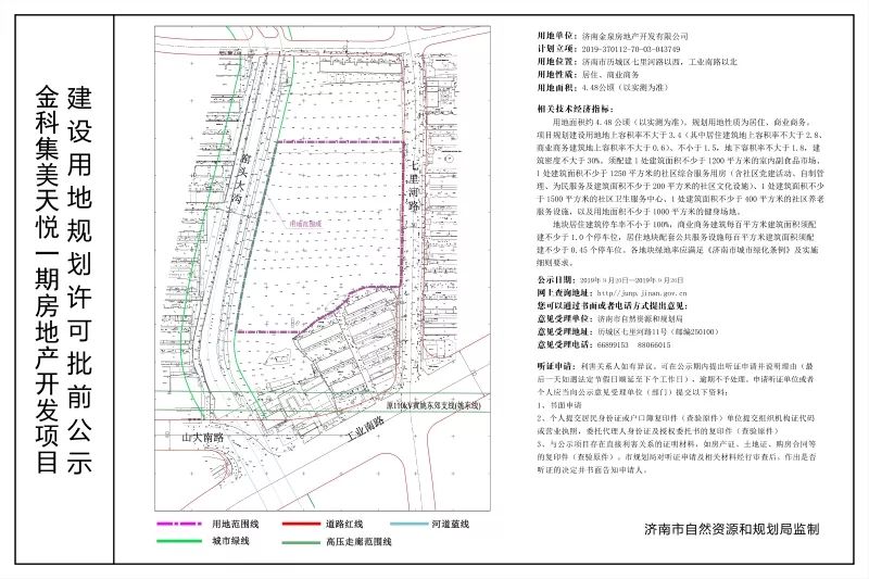 该项目就是金科拿下额七里河地块,位于历城区七里河路以西,工业南路以北,为居住、商业混合用地。 占地面积44851㎡,约67亩,地上最大容积率为3.4,地上建筑面积152493.4㎡。成交金额106746万元,成交楼面价7000元/㎡。