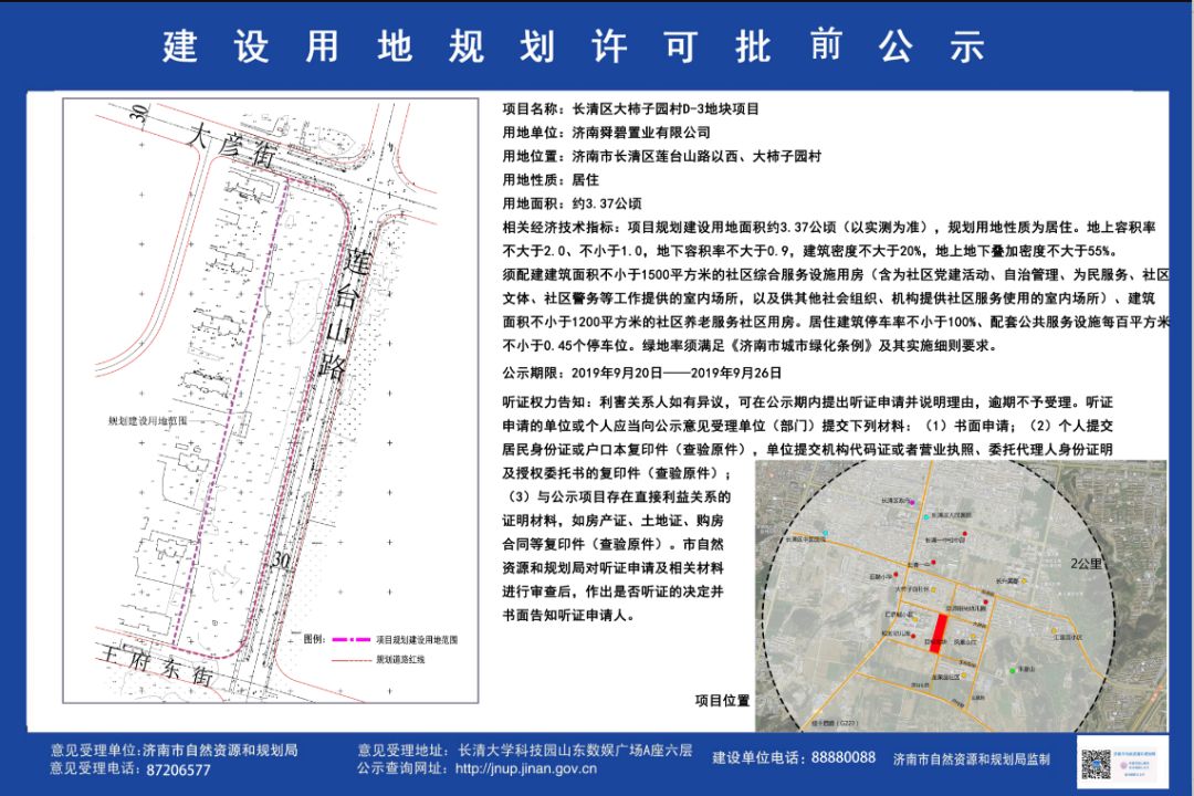 该地块就是8月19日,碧桂园在长清拿下的大柿子园D-3地块,住宅用地, 占地33669平米,建筑面积67338,容积率2.0,成交楼板价3525元/平米。