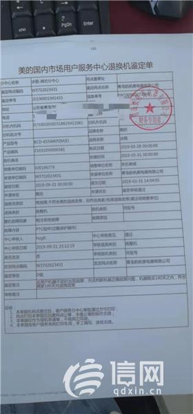 袁女士向信网提供了一份美的青岛授权鉴定网点的鉴定报告,报告中指出“此用户机器不定时出现故障,无法判断机器正确故障问题,机器购买180天之内,符合商家180天内退换政策。”