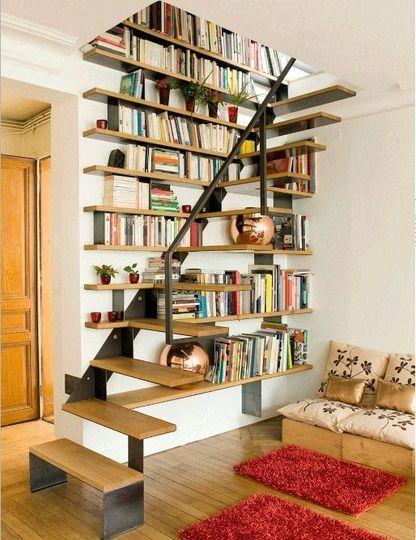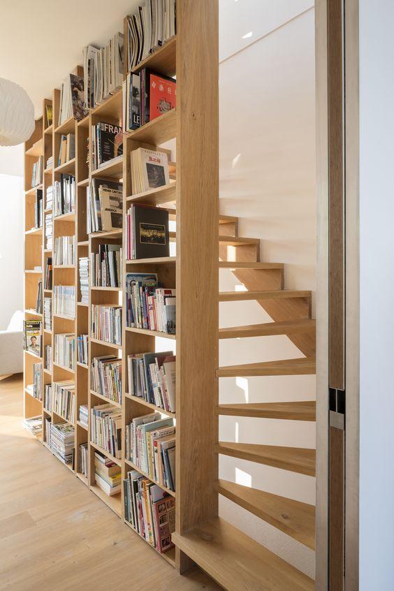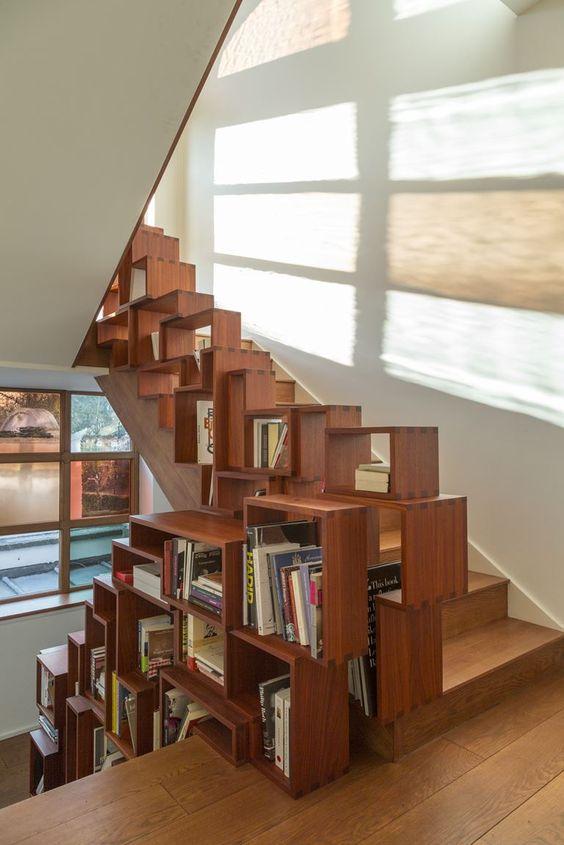 根据楼梯走势而建的书架,很好的利用了楼梯的阶梯优势,一级一级错落有致的组合在一起。想象一下,每天走在这样的楼梯上,随手就能拿到自己想看的书,是不是一件很幸福的事?