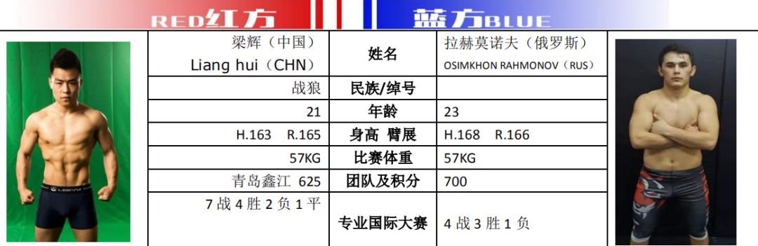 目前梁辉战绩18胜3负1平(整体战绩),胜率达到81.8%。他曾获山西省运会自由式摔跤冠军、河南省中国式摔跤冠军等荣誉。这次他将与俄罗斯悍将拉赫莫诺夫一决雌雄,期待他的表现!