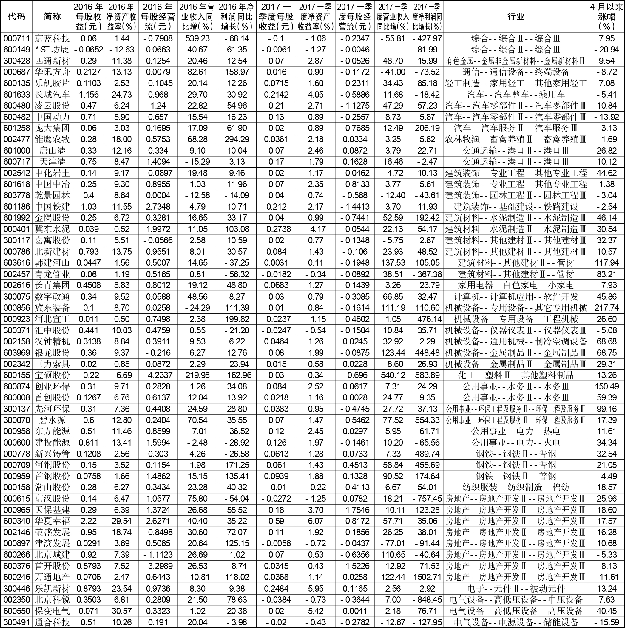 尽管4月中旬以来雄安概念的整体炒作已明显降温,但板块中仍不乏强势股的存在。4月份以来,涨幅最大的冀东装备已上涨217.74%,涨势十分喜人,当属雄安基建板块龙头股。排在其后的是创业环保,目前公司股价已创出年内新高,或已奠定其雄安环保板块第一龙头的地位。统计显示,4月以来涨幅在30%以上的雄安新区概念股共16只,其中3只个股区间涨幅超过100%,分别为冀东装备、创业环保和韩建河山。