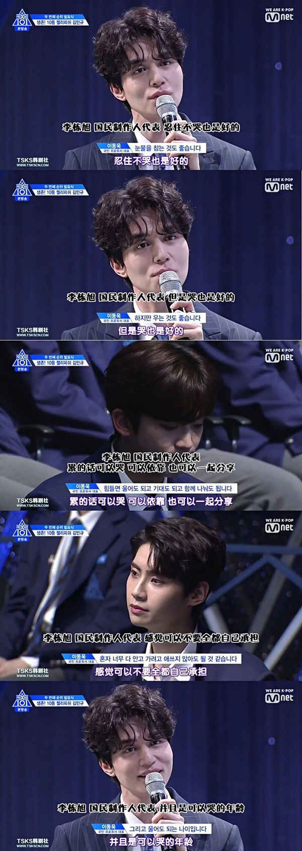 李栋旭其实是个十足暖男,非常贴心的前辈。主持《produce 101》的时候,拍着电视剧也去看望练习生,给孩子们真诚的鼓励,温暖的关怀,并且充当着人生导师和引路人的角色,“累的话可以哭,可以依靠,可以一起分享,不要全部自己承担,是哭也可以的年纪啊”,温柔的话语,令人动容。