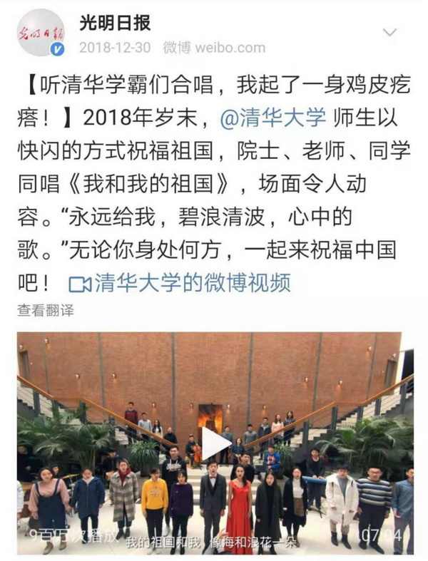 2018年《光明日报》官微就“清华大学合唱《我的我的祖国》”的描述是:“听清华学霸们合唱,我起了一身鸡皮疙瘩”。