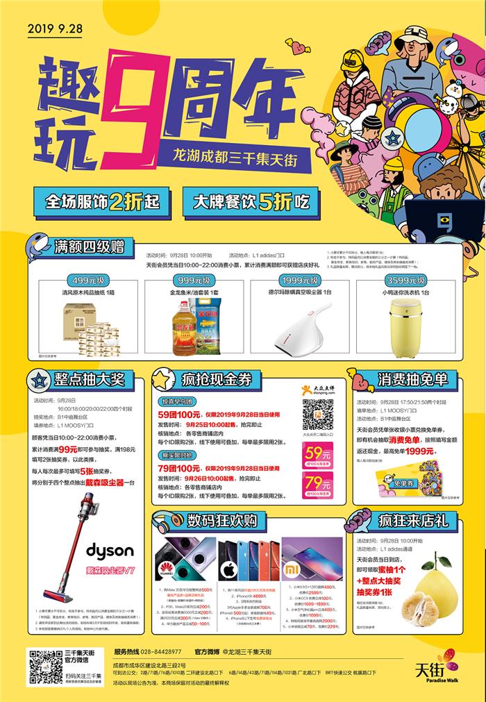9月28日,龙湖在成都第一个开业的商业项目-龙湖三千集天街即将迎来他的9岁生日一9周年店庆。