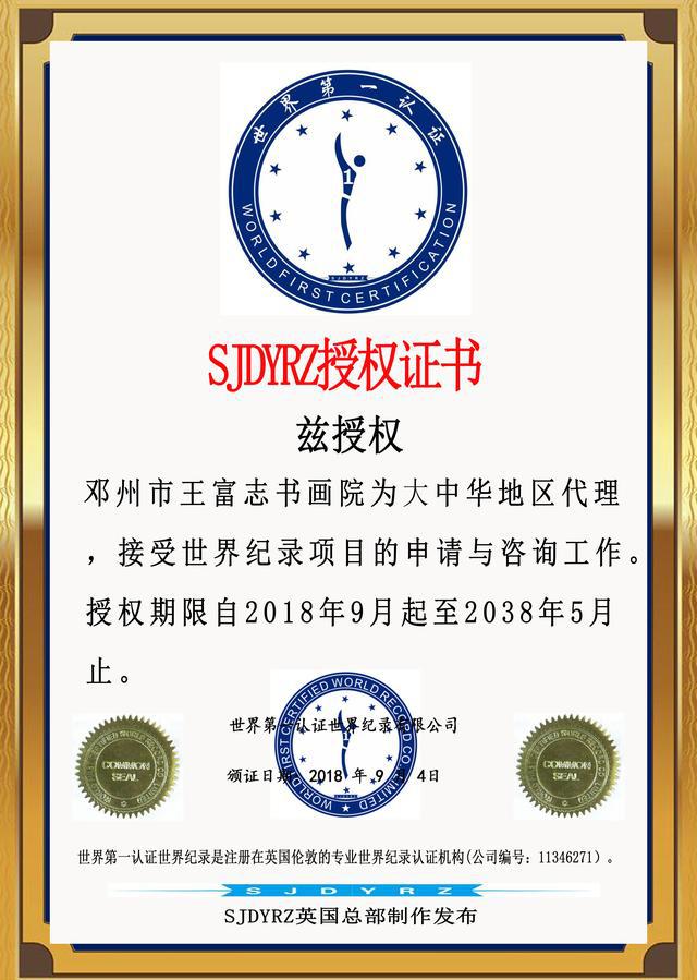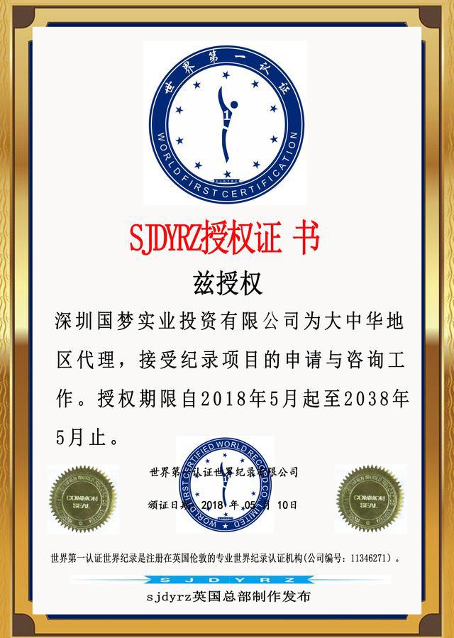 世界第一认证世界纪录是注册在英国伦敦的专业世界纪录认证公司,由深圳国梦实业投资有限公司和邓州市王富志书画院团队运营管理,兼具本土性和国际性,专业致力于为企业和个人提供专业的世界纪录认证、世界纪录创意和世界纪录策划,引进及结合其先进世界纪录认证理念与方法,与众多科研训机构进行深入战略合作,倾力打造成多语种、全球化、标准化的世界纪录认证机构。
