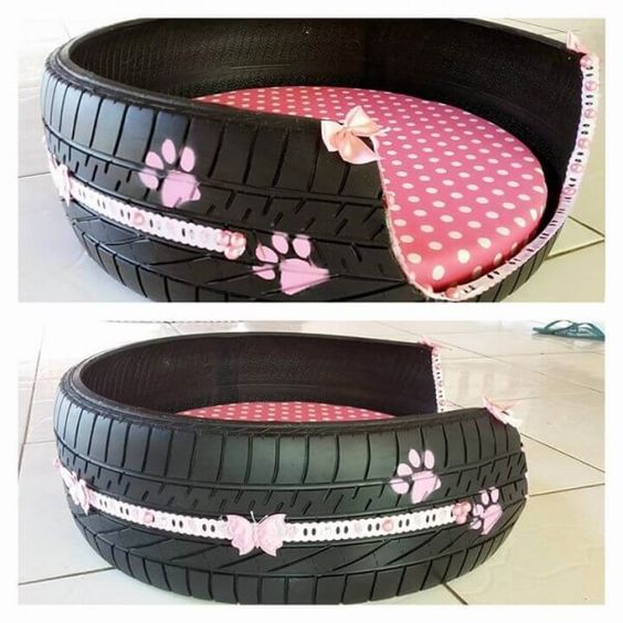 旧轮胎制成耐用,合理且易于制造的宠物床。橡胶可以清洗,上漆以达到设计目的且价格便宜。要为您的狗或猫创建一个大而舒适的床,只需剪掉轮胎的一个侧壁和一部分胎面区域即可。用舒适多彩的靠垫整理床铺。