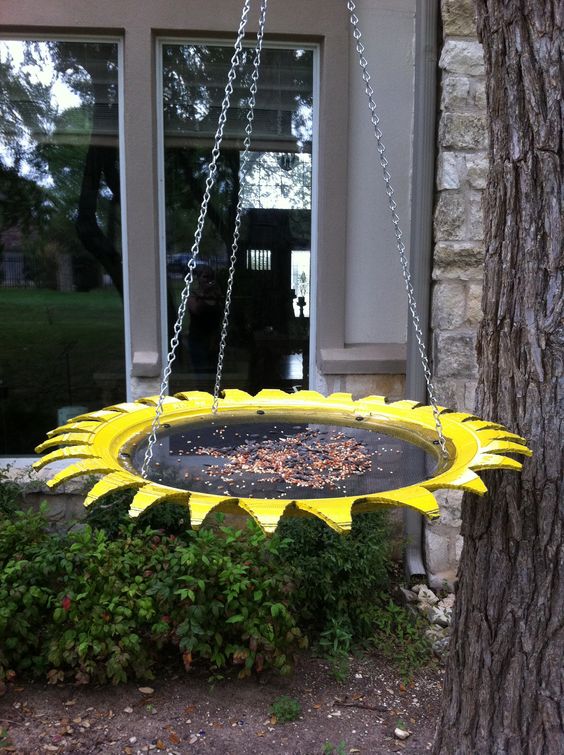 如何在后院增添一缕阳光?这种橡胶鸟羽毛是用旧轮胎制成的。从轮子的一侧切开,在中间增加了一个底座;这将保留种子和谷物。使用坚固的绳索或链条将其悬挂在树上。