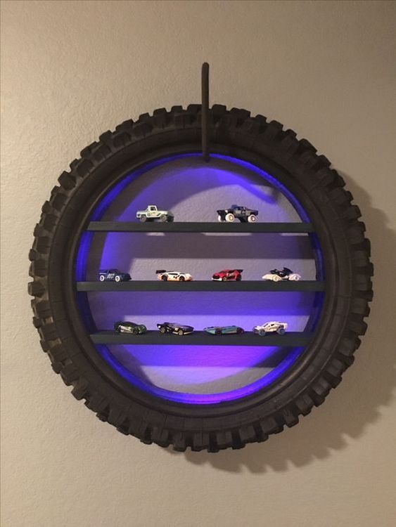 这款轮胎架子带来前卫的街头风氛围。又脏又黑,喜怒无常,光滑。清理一些摩托车轮胎,用频闪灯安装管子,然后在其中心增加两个或三个木架子。非常适合书房,十几岁男孩的房间和单身汉的任何墙壁。