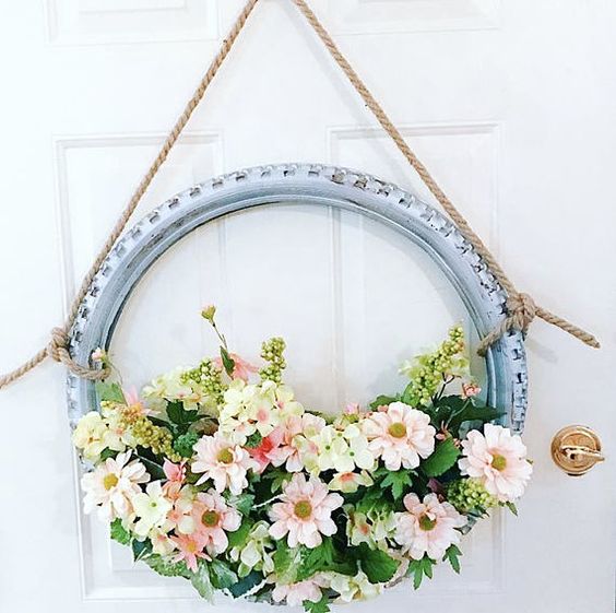 这是自行车轮胎的另一个漂亮的上轮选择–花环!用您最喜欢的柔和色调对旧轮胎和油漆进行动力清洗,然后在下半部分装满鲜花。要获得迷人的乡村氛围,请添加剑麻绳以突出口音和/或刮掉一些油漆,以营造出破旧别致的外观。