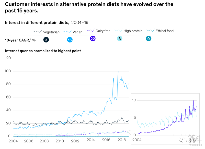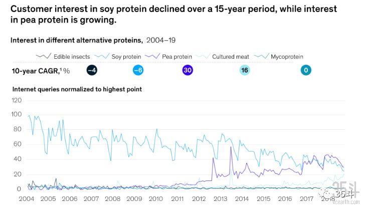 基于对搜索查询数据的分析,从2004年到2019年,人们对培养肉类搜索的年复合增长率为16%,对豌豆蛋白搜索的年复合增长率为30%,这种增长表明消费者对植物性的蛋白质来源感兴趣。