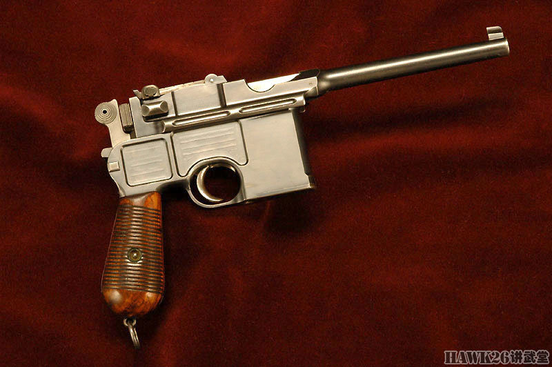 该枪是第一次世界大战之前制造的,所以与我们通常见到的毛瑟手枪有些区别,比如握把上面的方形切削区域就没有毛瑟商标。这是因为当时毛瑟还没有申请注册商标的缘故,我们熟悉的毛瑟商标是一战结束后才注册的。击锤形状也很特别,很像变色龙的眼睛,这也是早期毛瑟手枪的重要标志。
