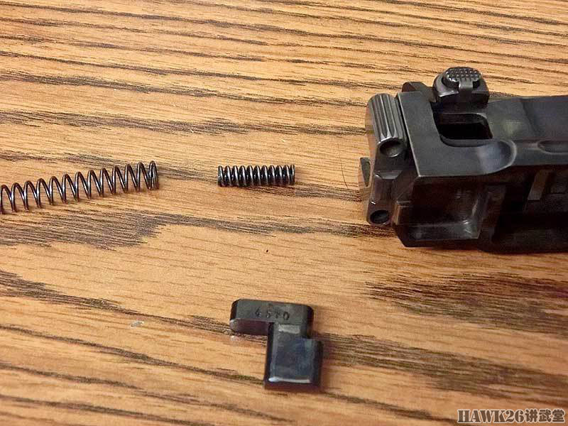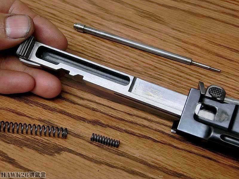 击针上有两个弹簧,大的是复进簧,小的击针簧固定在击针前端,需要使用工具才能取下。