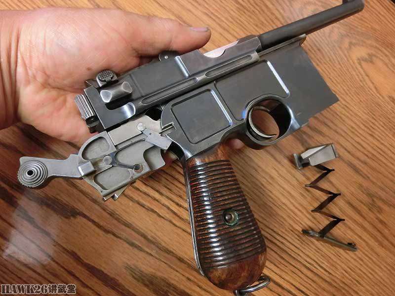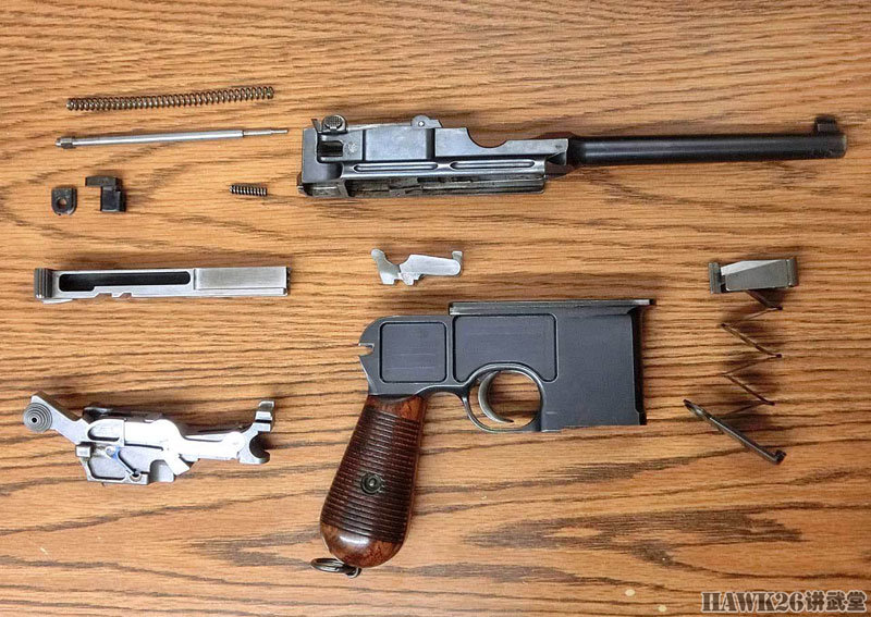 毛瑟C96手枪不完全分解状态。组装时,逆向操作即可,组装完成后需要检查机件是否可以工作。