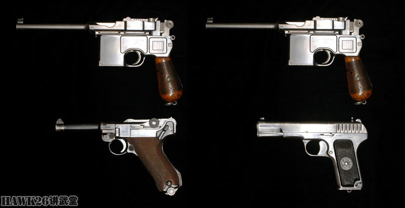 这是上世纪30年代三种手枪的外形对比,毛瑟C96重1120克,鲁格P08重900克,托卡列夫TT33重850克。尤其是C96与TT33发射类似的弹药,重量差距270克,与外形大小差距来说,其实重量差距并不明显。这是因为C96从表面到内部到处都可以看到减重设计。