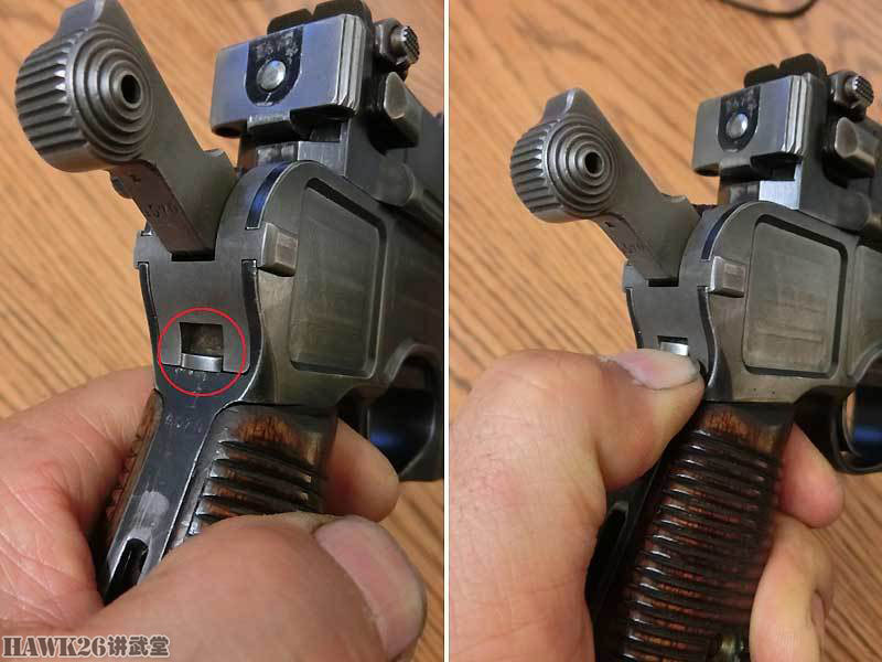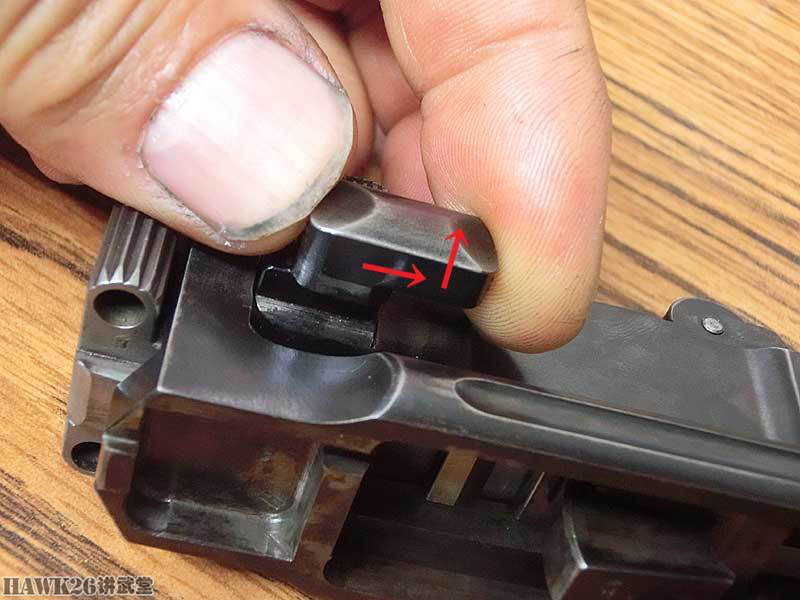 由于这步分解工作之前,已经拆下了弹仓的弹簧和托弹板,所以拉动一下枪机,这样可以检查弹膛内是否有弹药,同时还可以将击锤锁定到待击位置。随后向上推红圈内的卡笋。