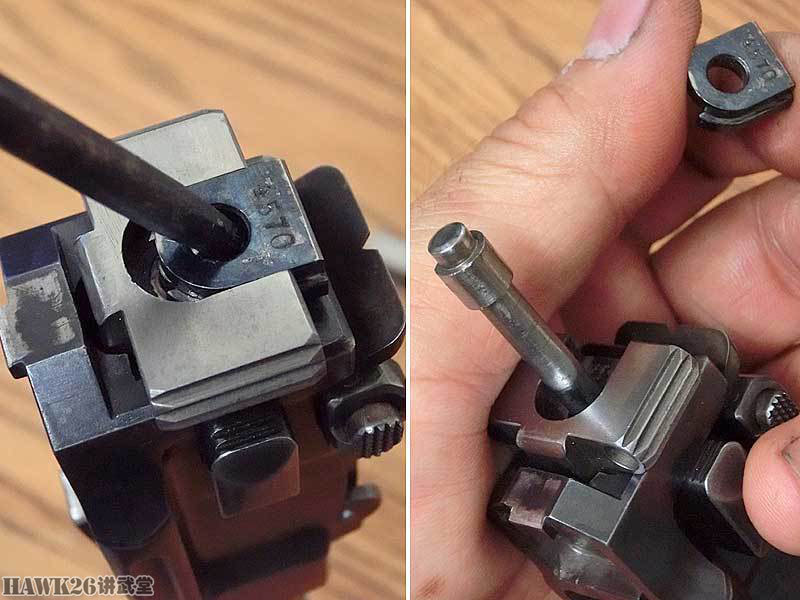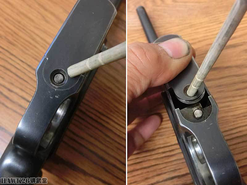 同样使用小木棍,顶住击针,然后向上挑,将击针阻铁从上面取下,然后就可以抽出击针。需要说明的是,击针弹簧很硬,需要用力才能完成这一步。