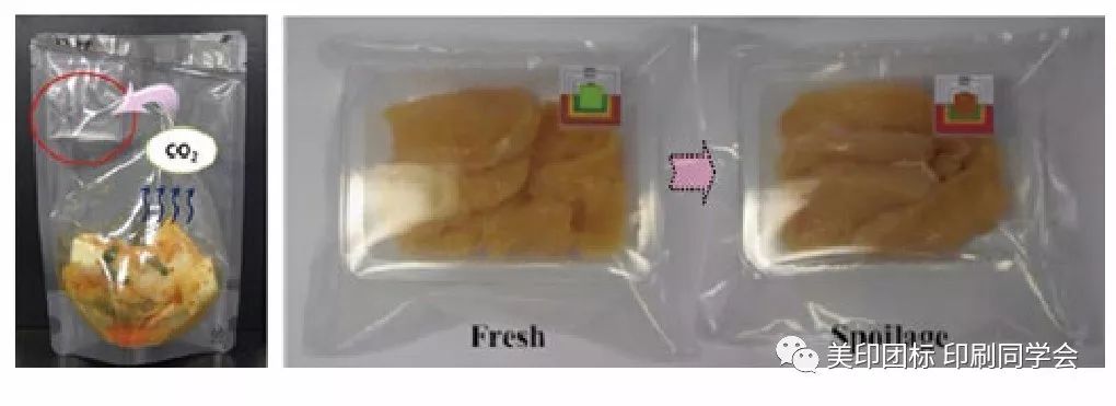 乳制品及发酵类产品中,CO2是微生物生长过程中的主要代谢产物,因此,CO2含量的上升标志着食品新鲜度的下降。韩国世宗大学Sanghoon Ko教授课题组研究发现在泡菜发酵过程中,乳酸菌生长代谢产生的CO2与体系pH变化具有强相关性,随着包装内的CO2含量不断增高,包装的pH值会迅速降低,而pH值的改变会影响壳聚糖大分子在水分散体系中的溶解度。基于此原理,他利用CO2在壳聚糖溶解程度不同所产生的溶液透明度不同(透明或浑浊)用来指示泡菜的新鲜度。该指示剂也可以用于指示和泡菜有相似发酵过程的米酒的新鲜程度。研究表明,采用MAP包装的禽肉类食品随着货架期的延长包装内CO2浓度呈上升趋势,泰国科学家C Rukchon采用了混合pH指示剂作为鸡胸肉变质过程中CO2的指示剂,证明了指示剂颜色变化与包装内CO2浓度、鸡肉TVB-N含量有关系,以此来反映鸡胸肉是否变质。