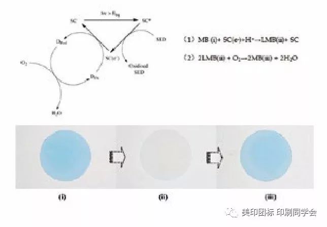 英国贝尔法斯特女王大学的Andrew Mills教授团队研究了一系列UV激活O2指示剂,体系组成都包括一种氧化还原染料,比如亚甲基蓝MB,一种给电子体SED和一种对UV光敏感的半导体催化剂纳米颗粒SC,把它们一起封装在聚合物里面(如图3)。当暴露在UV光下,半导体中的电子就从价带跃迁至导带,由此产生电子—空穴对。