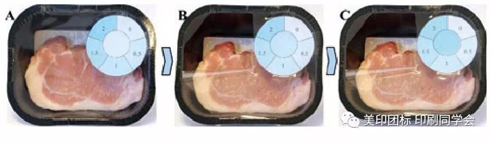 图4 O2指示剂在猪肉用于指示猪肉货架期 (中心区颜色,随着时间推移发生变化,颜色与和圆环上的上架天数比对)