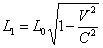 如果尺子的静止长度是L0,切向运动速度是V,那么,圆盘运动起来以后,尺子的长度记作L1。如果我们记光速为C,则运动前后尺子长度的关系是: