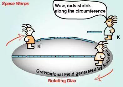 这是一个思想实验:在一个匀速旋转的圆盘上,我们在各个位置放上任意方向的尺子。我们很容易知道,盘子外侧的速度大,而内侧的速度小。因此,不同尺子的洛伦兹收缩程度是不一样的。