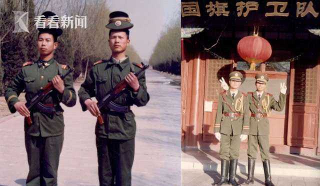 牛建波向我们展示了营地里的宝贝,这是战友们收藏在国旗文化展示厅里的照片和老物件。它们都是老兵们在天安门护卫国旗的难忘记忆。2018年元旦,武警天安门国旗护卫队番号正式取消,转隶属中国人民解放军三军仪仗队。牛建波也被邀请,在天安门见证了换装后更加威武雄壮的国旗护卫队。“现在,旗杆下不再有原来的两名升旗手。挂旗,摁动按钮,抛旗,升旗,一个动作全部由现在的擎旗手来完成。每月的一号为重大升旗,队员会由原来的66名增加到96名,其中增加这30名队员是在金水桥的南侧,呈八字形站立,等待着升旗的开始。而这时候在天安门城楼上,会有8名司号手吹响司号,而后预示着新的一天,新的升旗仪式即将开始。”
