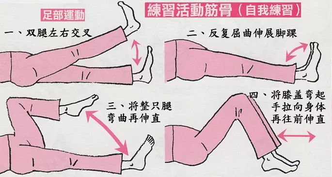 训练方法:患者取卧位座位或者是靠坐在床头,与肢体不负重的情况下被动或者主动活动四肢,做轴膝关节的屈伸,指关节的舒展和屈伸等运动的练习,每天宜多次进行肌肉收缩交叉训练习.当患侧肢体炎症明显疼痛剧烈,需要完全制动休息时,可以通过健侧肢体的运动引起肌收缩的阶段性交叉效应,从而对患者产生类似的运动刺激,防止或者是延缓肌肉的萎缩.