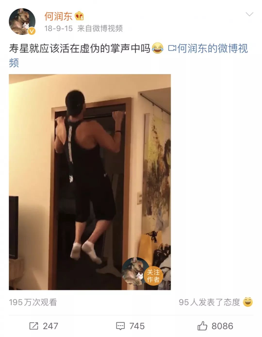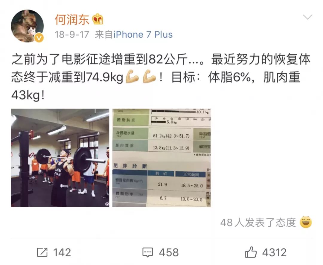 但其实,熟悉何润东的人都知道,何润东根本就没有放弃过健身这件事。 很多文章都是跟风乱写,所谓发福毁容照,不过是前两年的照片而已,那时候因为剧情需要剪了光头,加上画面角度问题才拍成这样。 (东哥表示不服! )