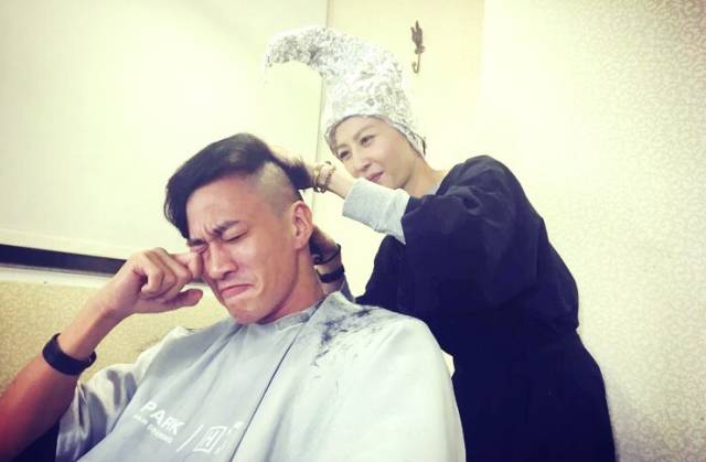 为了拍戏,需要剃掉头发,老婆帮他剪头发时故意流露出的小委屈,还真有点搞笑。