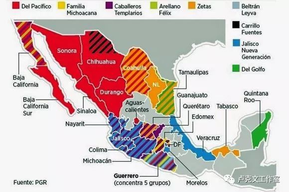 现在墨西哥只存2个毒帮,锡那罗亚和 CJNG。其他的都是小打小闹。左边的红色 是锡那罗亚的地盘。黄色familia michacana 是 家族 的地盘。紫色是 圣殿骑士团,这是从家族分裂出来的, 主要在中部的米却肯州。黄色 zetas 就是大名鼎鼎的泽塔斯。主要在墨西哥湾。就是地图右边。绿色 是 海湾 ,也就是CDG。蓝色 就是 cjng, 从哈利斯科州起家的 哈利斯科新一代集团,从锡那罗亚分出来的。现在实力最大就是 锡那罗亚 和 CJNG