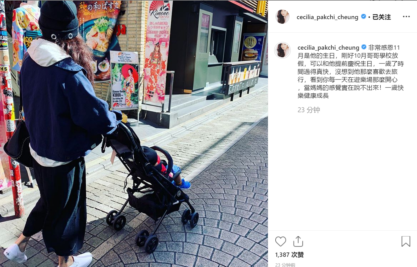 近日张柏芝带着国庆放假的二儿子Quintus以及三胎小王子一起去日本度假,此前张柏芝还晒出了一张推着婴儿车的背影照,在旅行中提前给即将满一岁的Marcus庆祝生日。