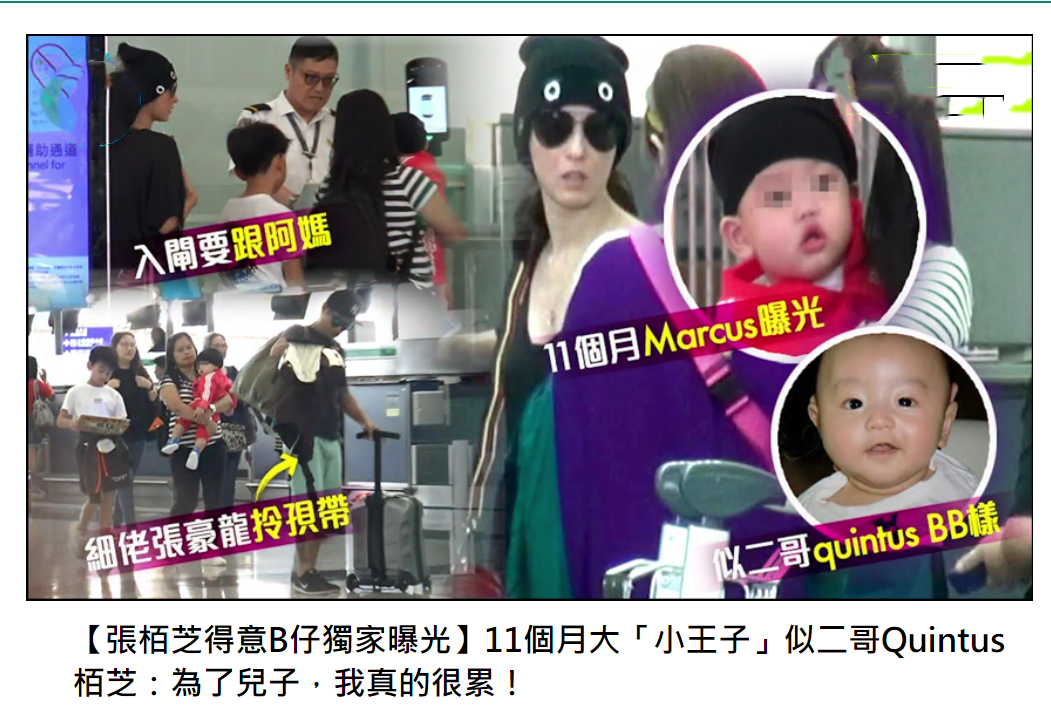 10月9日,港媒曝光张柏芝第三胎儿子的正脸照,11个月大的Marcus长相神似二哥Quintus小时候,同样的可爱。