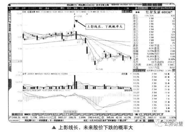 影线代表转折信号,向一个方向的影线越长,越不利于股价向这个方向运行,以上影线为例,在经过一段时间多空斗争之后,多头终于晚节不保,败下阵来。不论K线是阴线还是阳线,上影线部分已构成下一阶段的上涨阻力,股价向下调整的概率居大。以红星发展(600367)为例,在股价大幅高开之后,盘中大幅走高,早盘逼近涨停板,但是午后股价逐波回落,收盘微涨不足1%。在K线图中,当日收出一根带有长上影线的小阴线,这是股价即将下跌的信号,之后的交易日,该股的股价出现了大幅调整。同样的道理,K线图中出现下影线预示着股价探底回升,股价向上攻击的概率巨大。