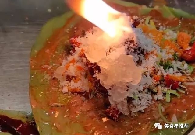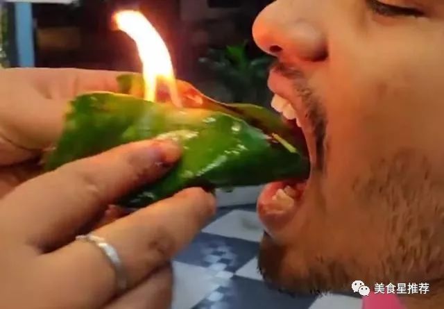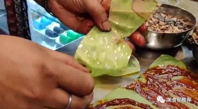 只看到印度小贩拿了一张叶子放到清水里洗,然后拿起放到桌子上,接着往里面加入一些酱料,之后加入各种各样的食材。当全部食材都加完后,那么就可以用火柴点燃一下火焰啦。