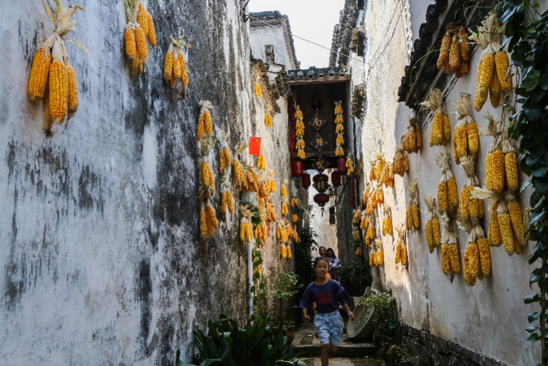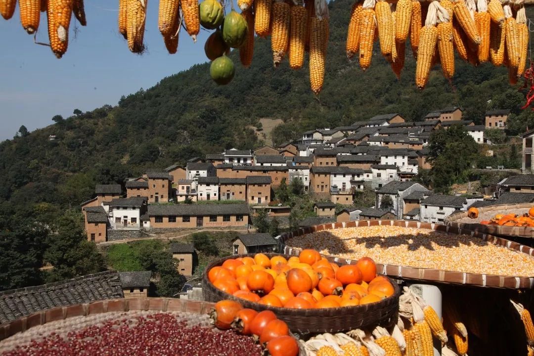 位于江西婺源的篁岭村,每年秋天都吸引了一批前来观赏“晒秋”美景的游客、摄影爱好者。篁岭村依山势而建,几百座徽派民居沿山坡排列,错落有致。每到秋天,家家户户拿出圆匾,在自家窗台或屋顶架晒农作物,红的辣椒、黄的苞谷,色彩缤纷,层层叠叠,与白墙黑瓦的徽派民居构成了一幅完美秋收画卷,被称为“最美中国符号”。